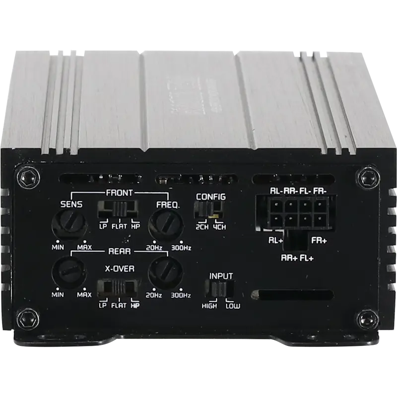 Amplificador de 4 canales de reducidas dimensiones, crossover activo integrado y función de encendido automático.