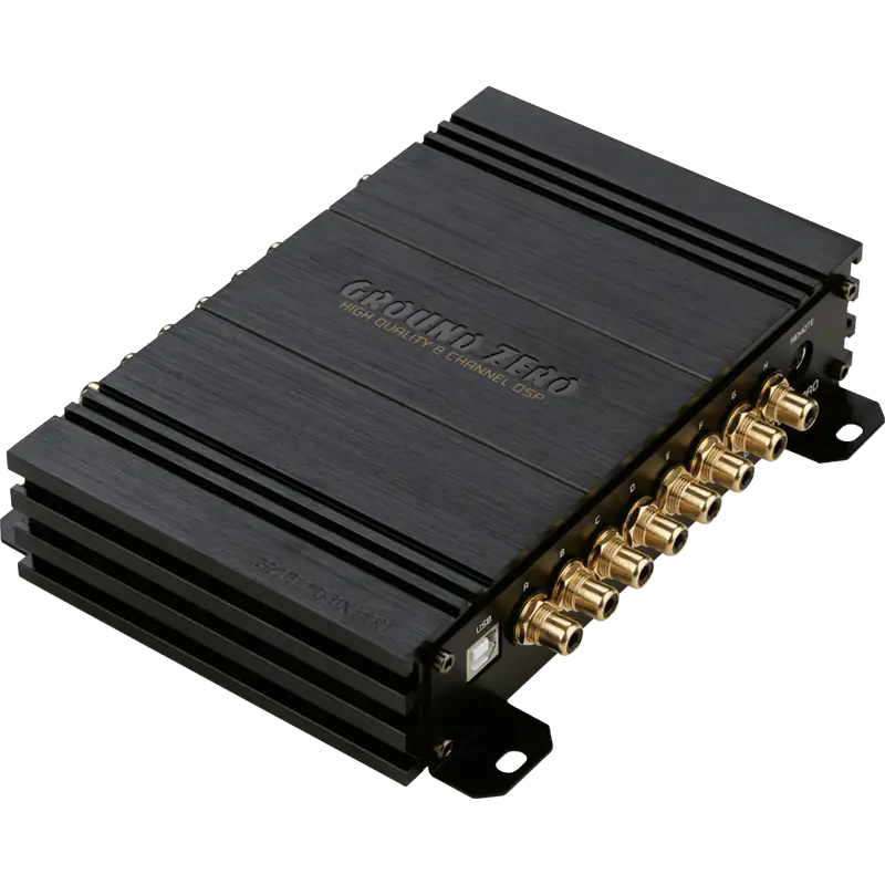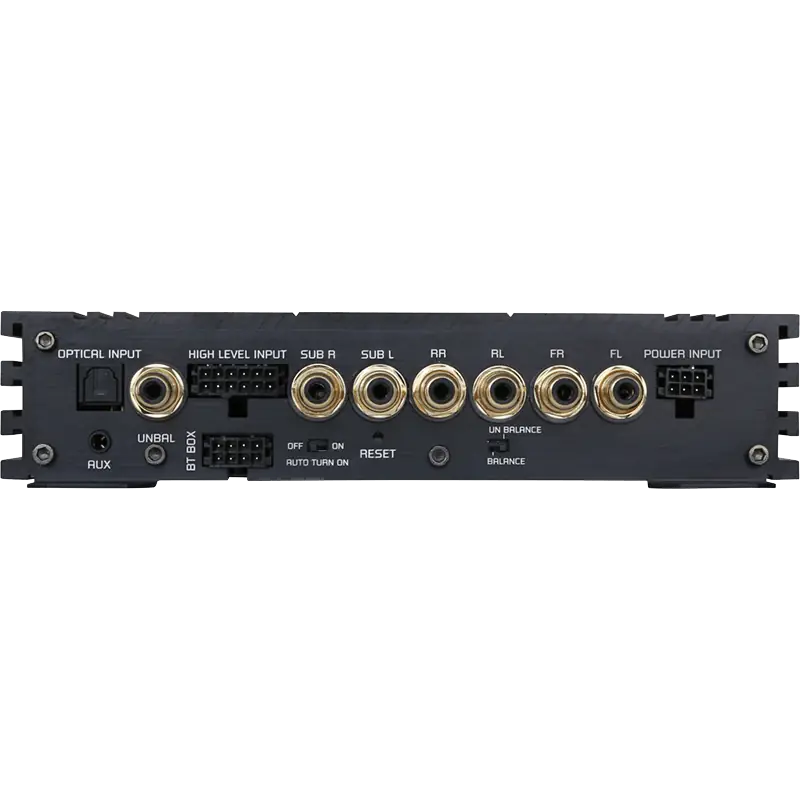 Procesador de señal digital con entrada de alto nivel o RCA de seis canales, conexión USB, entrada digital y AUX, así como función de encendido automático.